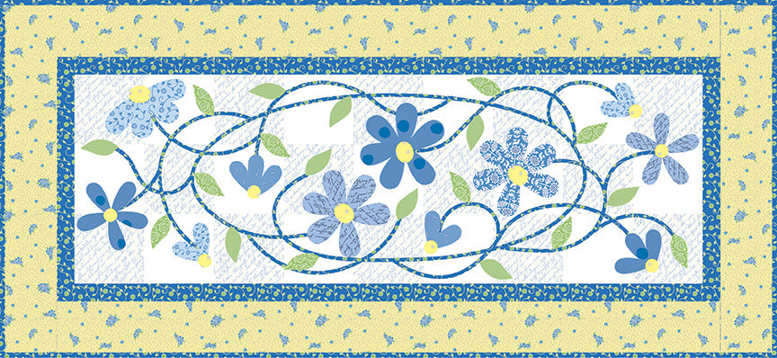 The Tangled Daisies Table Runner by Jillily Studio has a simple checkered background with a tangle of vines and blooms. The appliqued daisies dance across the runner accented by the dark vines and leaves. The perfect little runner for any table! The pattern includes full-size placement diagrams for your appliqué. Finished size is 20" x 44".