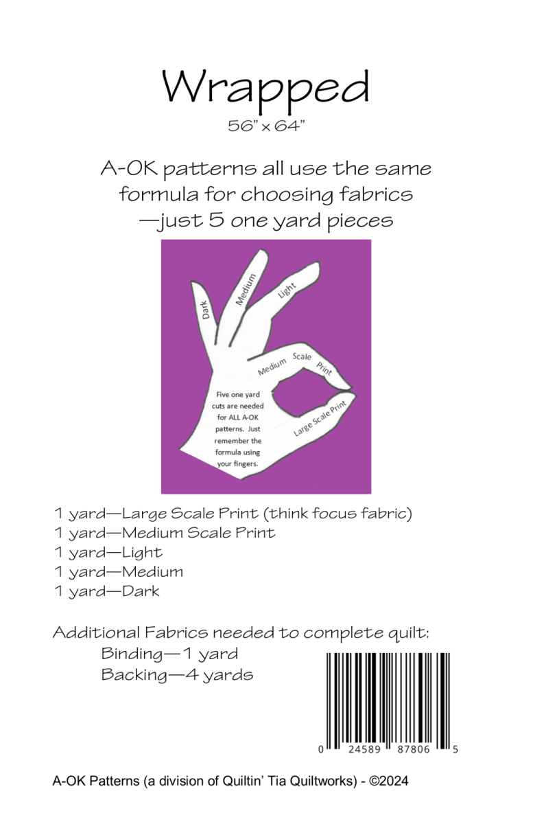 Use the A-OK finger formula to pick your 5 one yard cuts. One large scale print, one medium scale print, one light, one medium, one dark. That is all! Formula works for ALL A-OK patterns. Pick your fabric, pick your pattern.