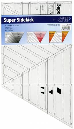 This ruler cuts diamonds, triangles and half triangles. Each ruler comes with full color directions. The Sidekick and Hex N More rulers can work together or alone. The shapes and sizes cut from each ruler can work together to make unique and interesting designs. All of the pieces can be rotary cut from strips.